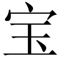 (形声。甲骨文字形,象房子里有贝和玉,表示家里藏有珍宝,会意。在西周金文里,又加上一个声符“缶”(古音与“宝”同)。本义:珍宝)