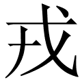 (会意。从戈,从十。“戈”是兵器,“十”是铠甲的“甲”。本义:古代兵器的总称。弓、殳、矛、戈、戟为古代五戎)