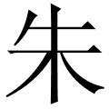 [1]红色:朱红。朱批。朱笔。朱文(印章上的阳文)。朱门(红漆大门,旧时指豪富人家)。