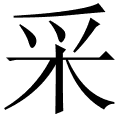 又如:采缯(彩色丝织品);采服(彩色的衣服);采章(绘有彩色图案的旌旗、车舆及服饰)