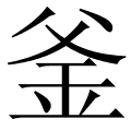 [2]古量器。春秋、战国时代流行于齐国。现有战国时的禾子釜和陈纯釜,都作坛形,小口大腹,有两耳。如:釜庾(釜和庾,均古量器名。引申指数量不多);釜鼓(釜和鼓。古代量器名);釜钟(釜和钟,皆古量器名。亦指数量不多)