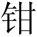 卡钳 钳子 钳锁 钳钳 口钳 钳语 蟹钳 焊钳 钳桎 钳网 钳奴 钳卢 拘钳 踏脚钳 鳄鱼钳 楚人钳 钳马衔枚 钳口结舌 克丝钳子 结舌钳口